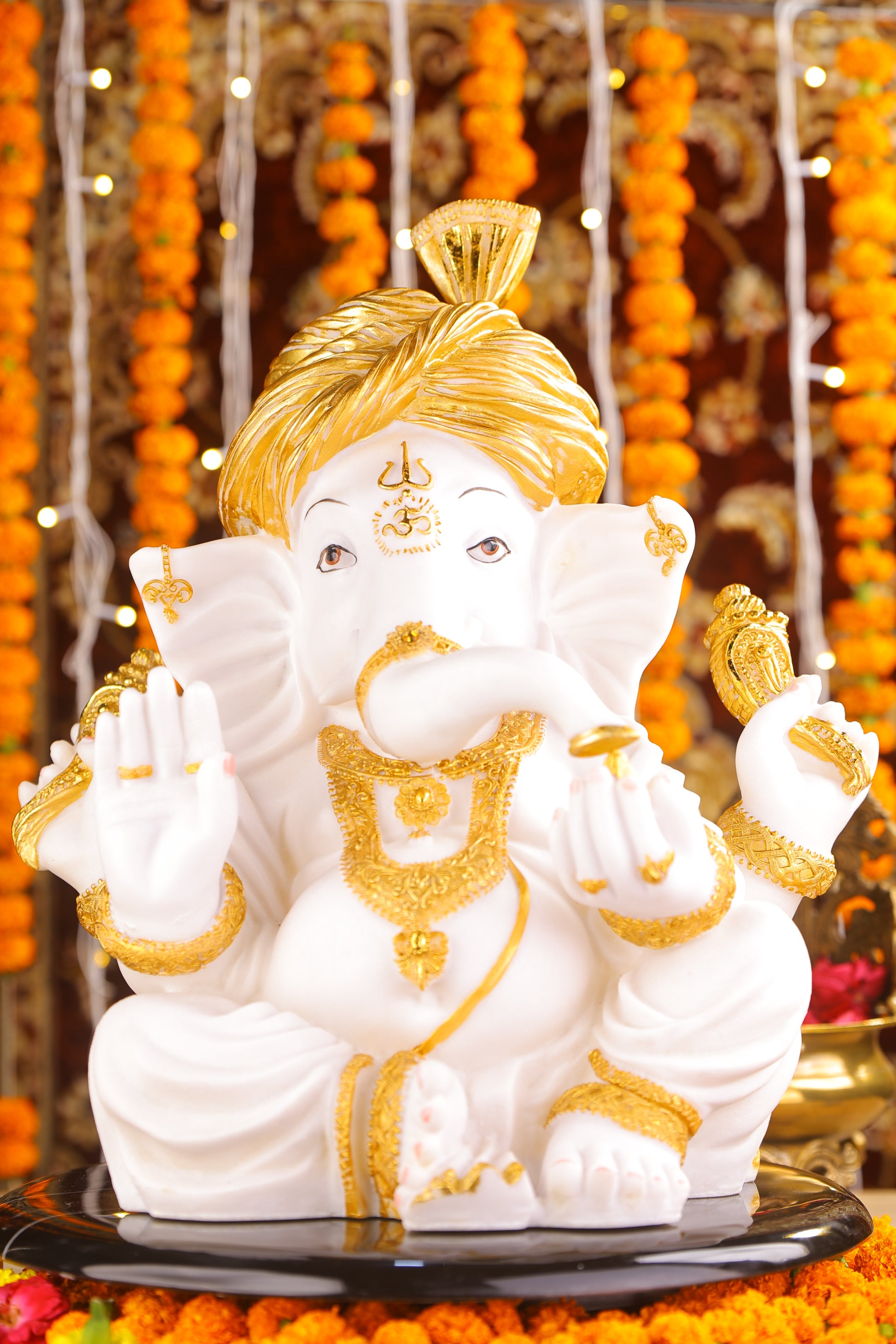 18" Ganesha sitting Marble statue with golden turban and modak | Ideal for temple or showpiece