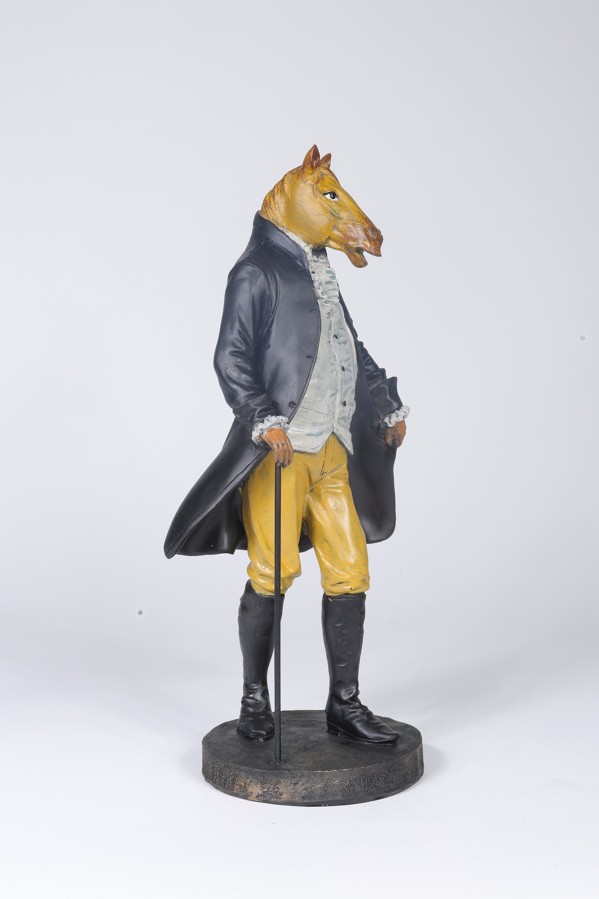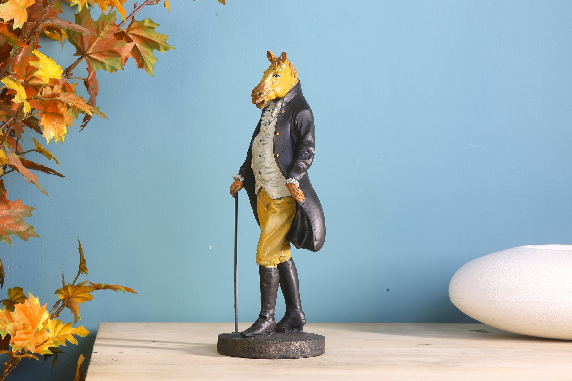 Add a touch of whimsy and royalty to your living room decor with this Noble Steed Statue. This majestic horse figurine features a human form with a stick in hand, wearing a regal long grey coat. Made of durable polyresin, it's easy to clean and makes for a great conversation starter or gift option. Urban Wilds, where city life meets the wild!