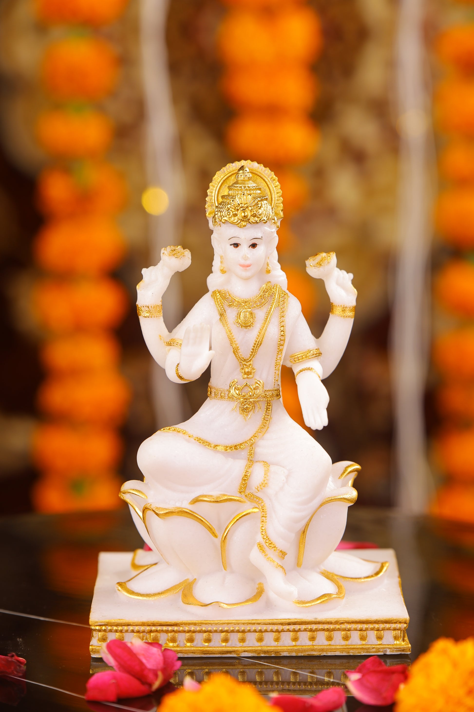 5" Laxmi Sitting Marble statue on lotus with gold tone | Ideal for temple or showpiece