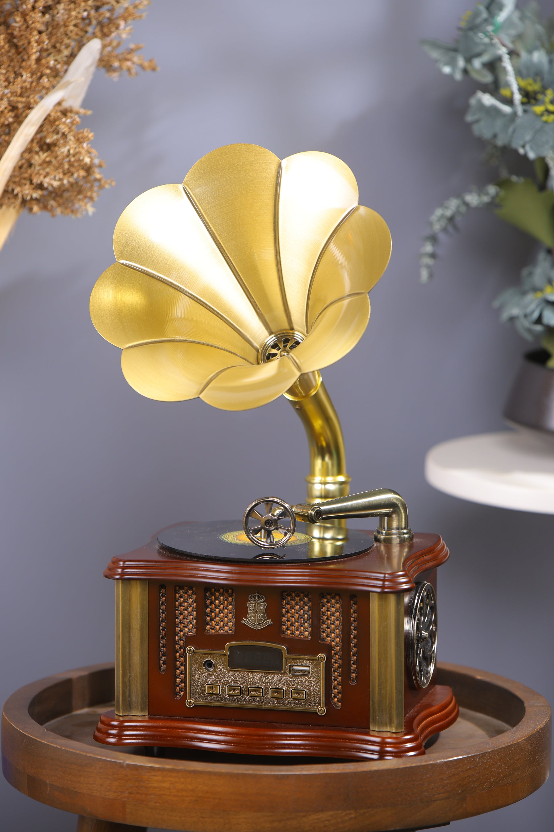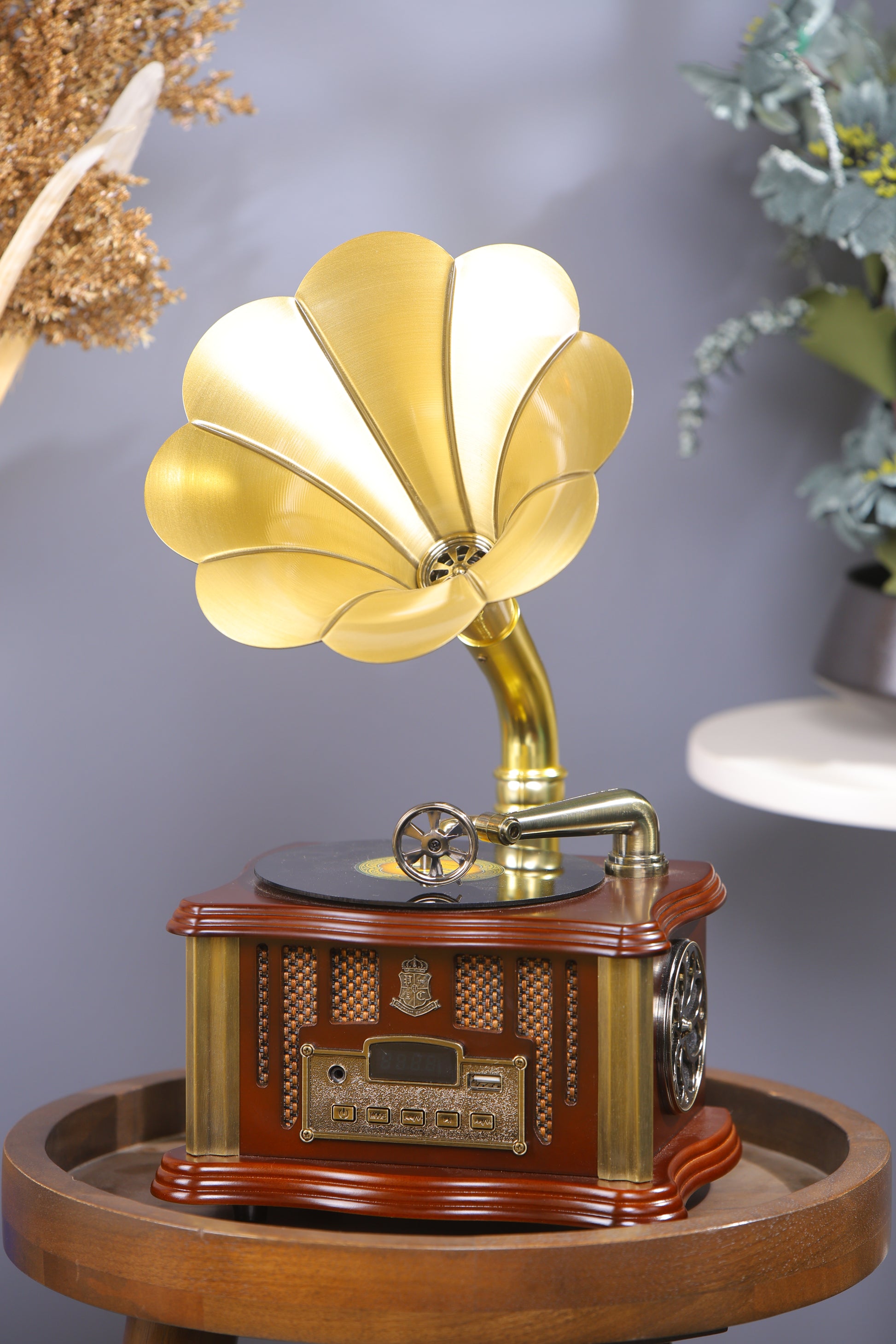 The RetroTone bluetooth Gramophone in classic brown offers a nostalgic music player with a modern twist. With a built-in woofer and high-quality sound system, it's the perfect plug-and-play speaker for any music lover. Plus, its vintage gramophone design adds a touch of retro charm to any room. (No more boring speakers, this one will "amp up" your decor and music experience!)